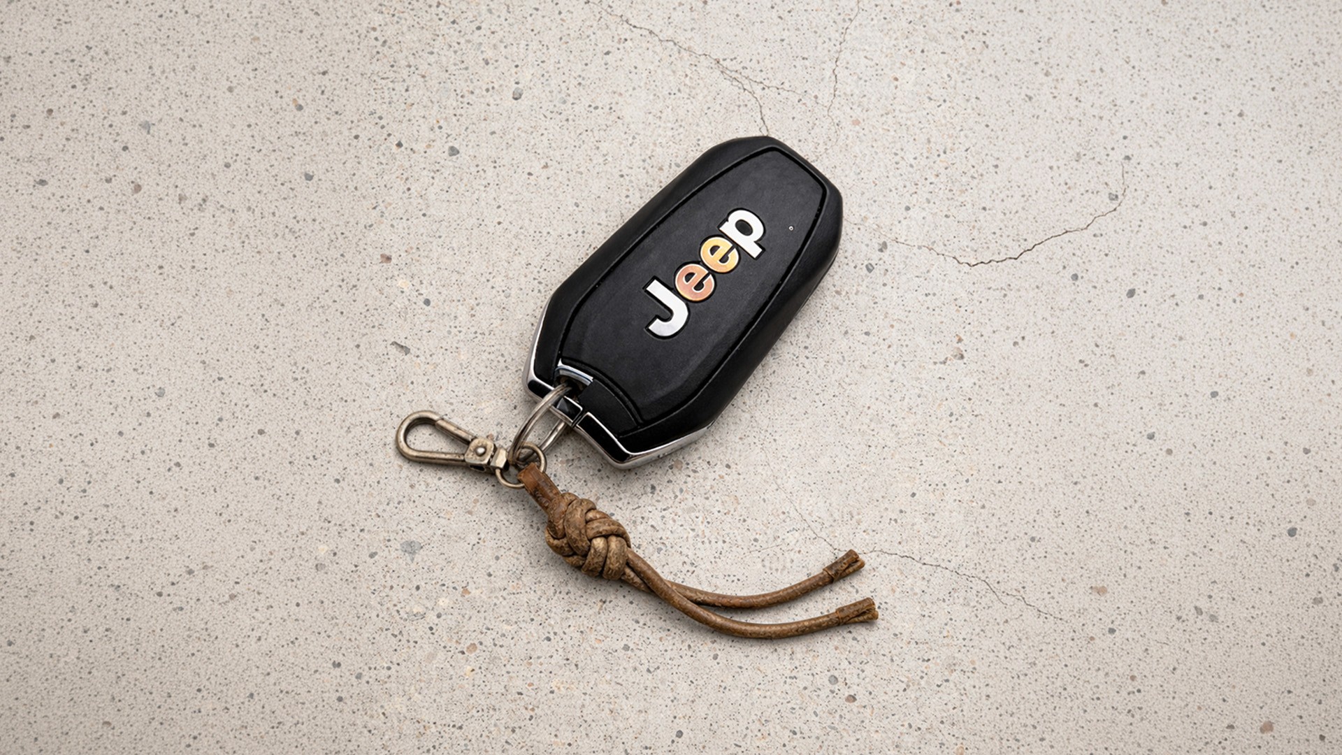 The visual system uses three Jeep models to represent different moments in life, all connected by the same keychain. The focus is placed on the relationship between object and time. Each stage pairs a different vehicle and its key with the same keychain at a different level of wear: